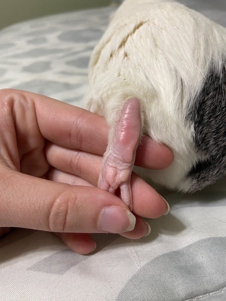 To check the penis and anal sack – fully extrude the penis to check for debris and any gritty/ sandy textured deposits. Check the anal sack for signs of faecal impaction or a grey fungal lining.