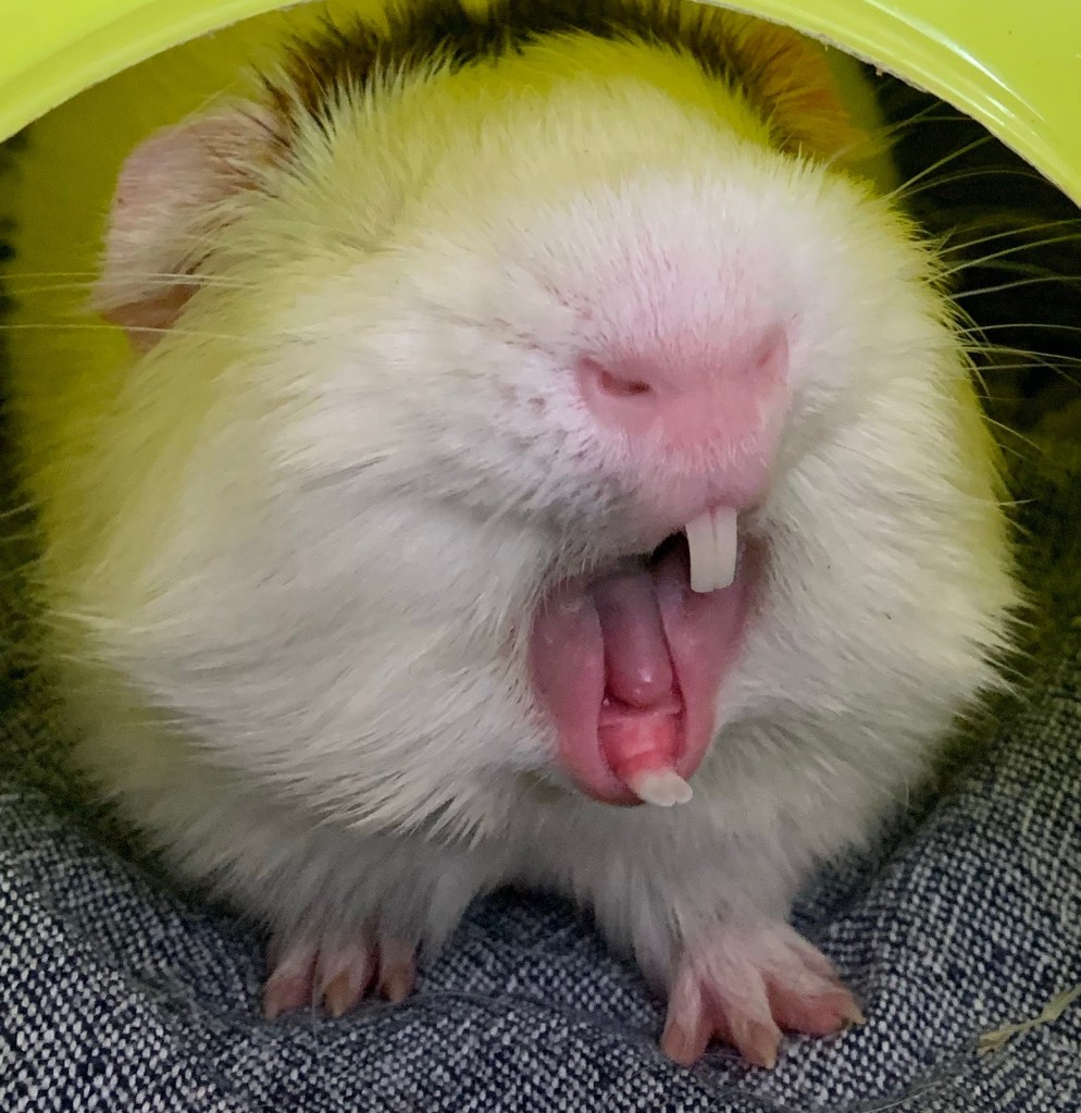 To check the teeth – You should wrap your Guinea Pig in a towel, so that they are safe from any injuries snd then slowly place your pinky finger into their mouth and feel around especially at the back, due to not being able to properly see the molars without a special tool. Feeling around will help you know wether they are too overgrown or not.