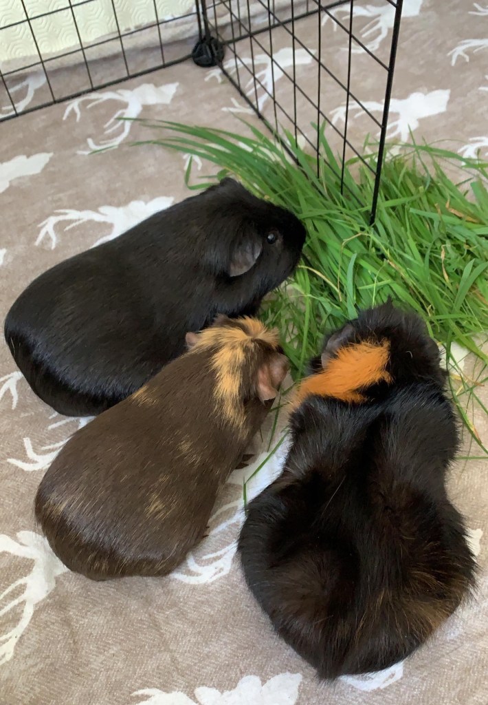 When they’ve settled in after a few minutes and are enjoying their yummies, place the younger/ newer Guinea Pig in and place him next to the treats so he can start eating too. The older ones will probably notice him after a few seconds and start Rumble Strutting and humping (this is normal) just sit with them the entire time you’re willing to try and bond them for.