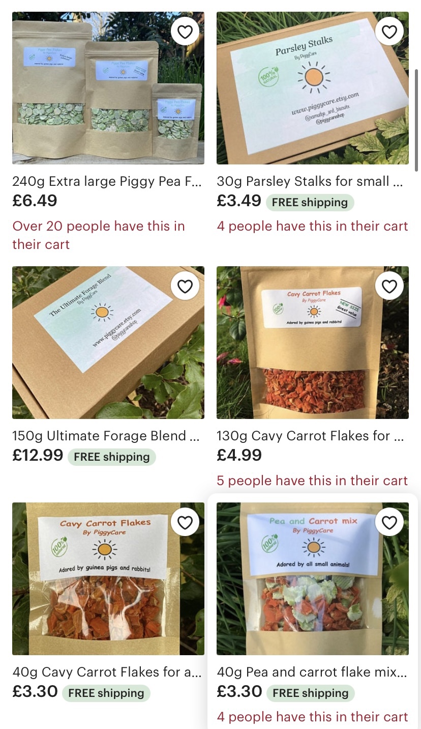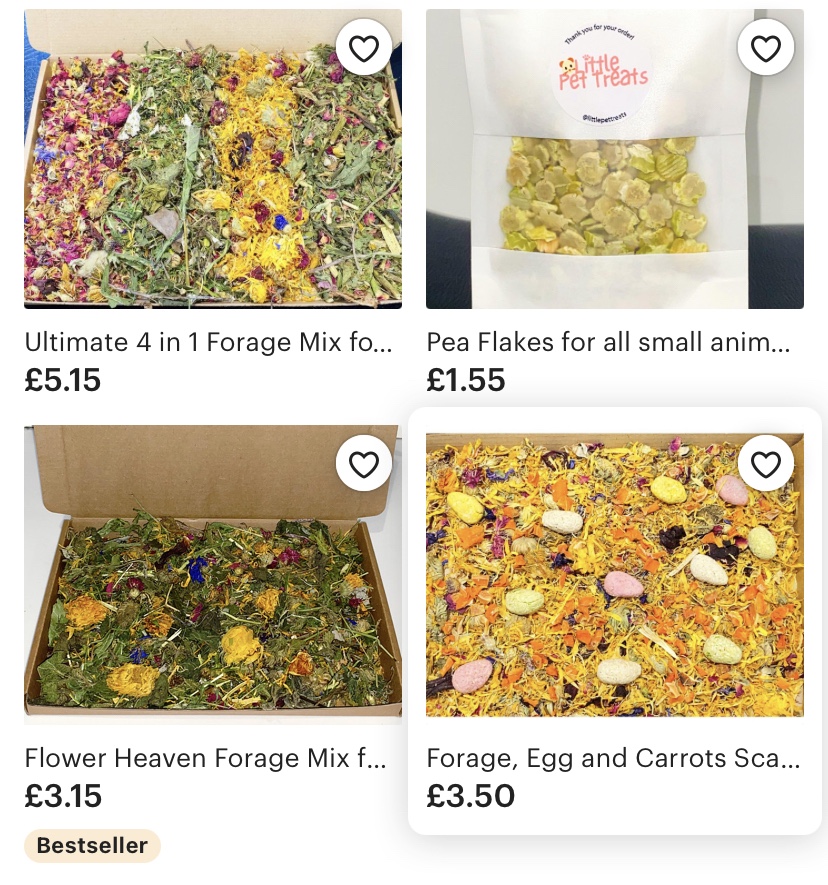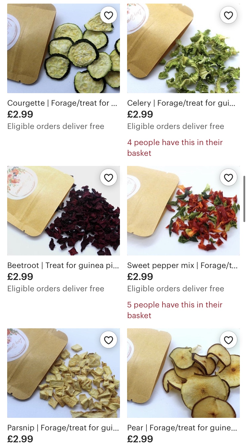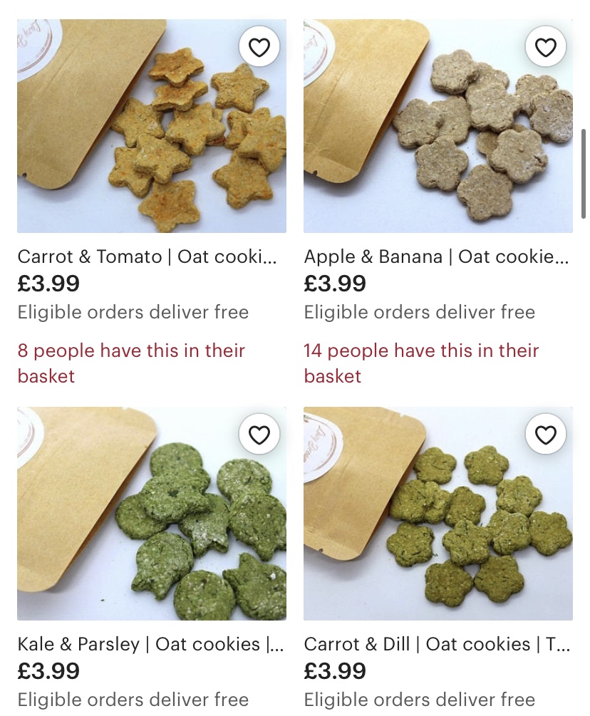 I have found that the best treats you can ever buy your Guinea Pig are from the small businesses on Etsy… why? Because they’re home made, completely natural and you know exactly where they are coming from. I also like how if you have any questions about what is in the treats, they’re happy to give you a list. Here are a few: