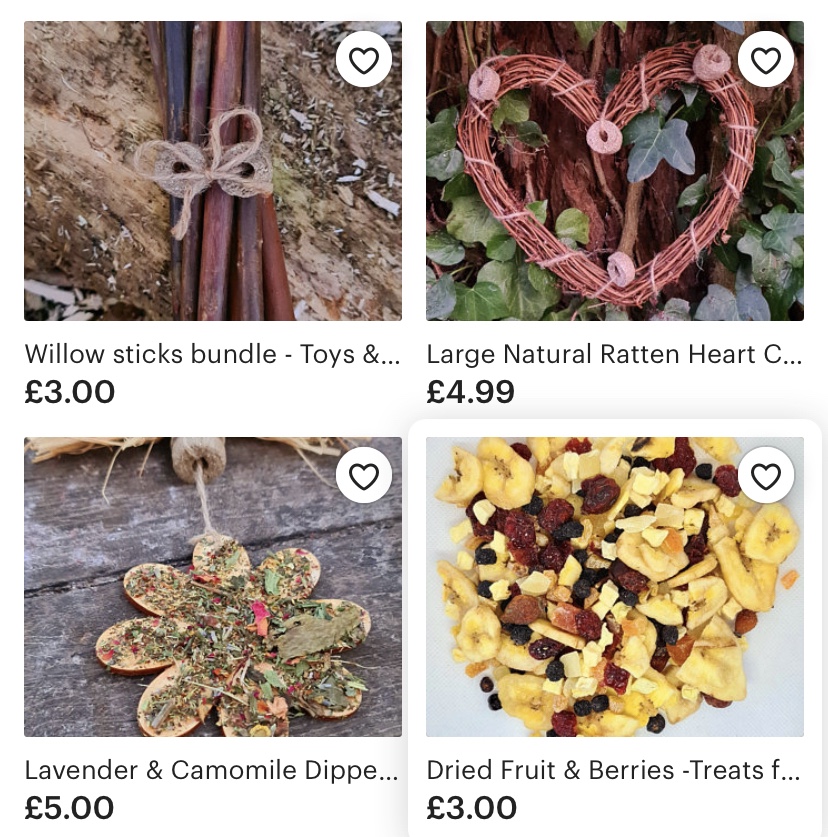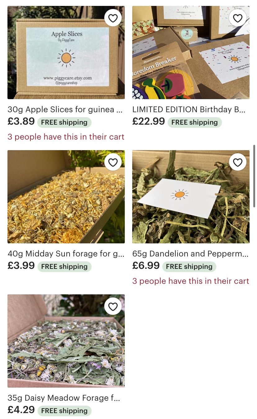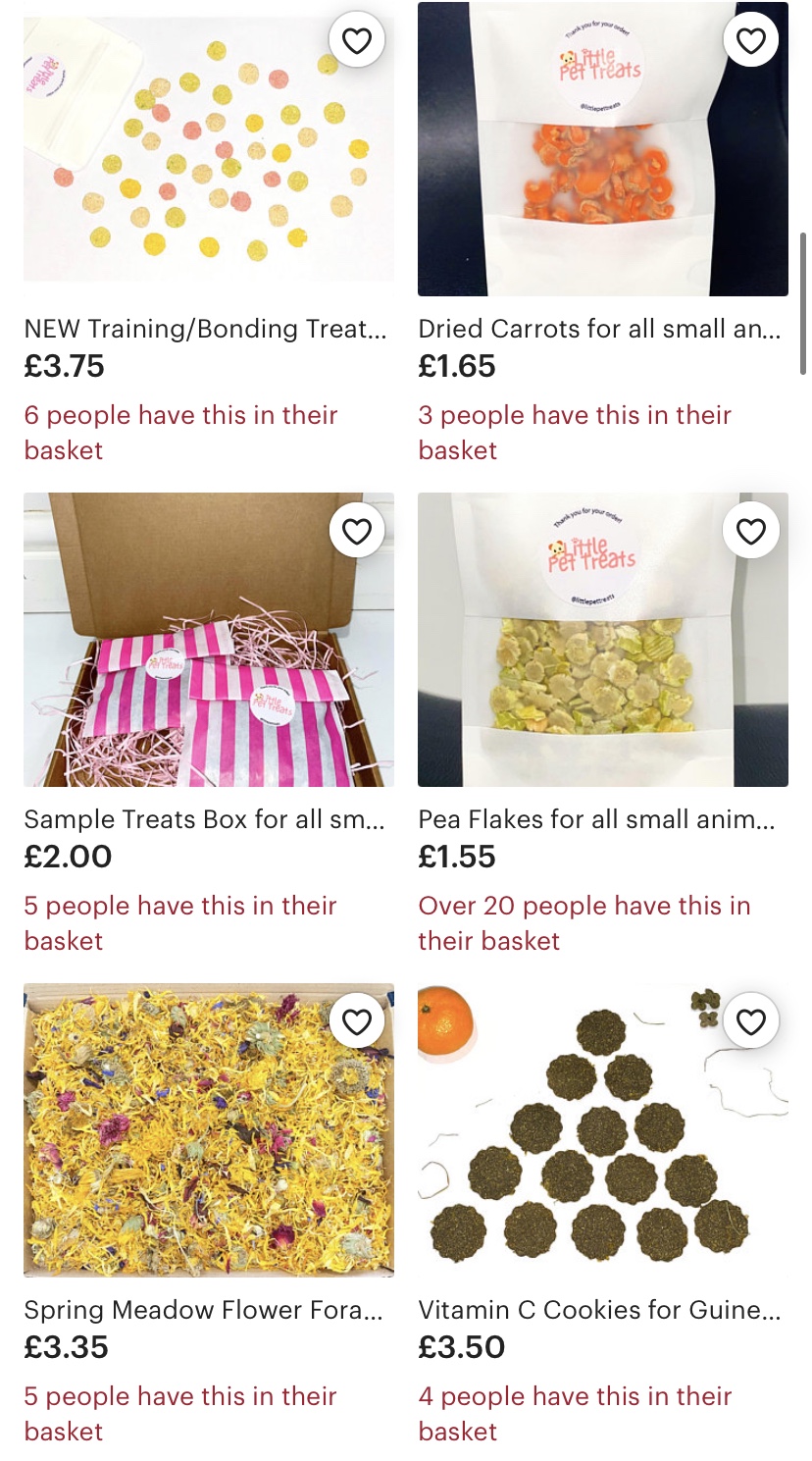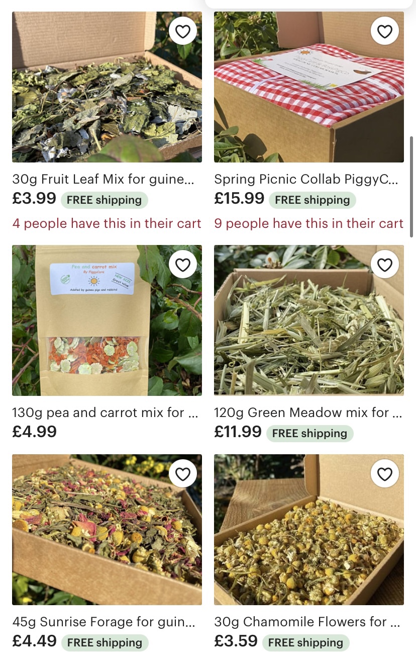 I have found that the best treats you can ever buy your Guinea Pig are from the small businesses on Etsy… why? Because they’re home made, completely natural and you know exactly where they are coming from. I also like how if you have any questions about what is in the treats, they’re happy to give you a list. Here are a few: